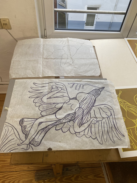 In der Werkstatt von Ellen Sturm-Loeding in Hamburg hat Emma Talbot einen farbigen Linolschnitt geschaffen. In drei verschiedene Platten hat die Künstlerin ihr Motiv geschnitten, eine für jede Farbe. Der Hochdruck zeigt eine hybride Gestalt, halb Vogel, halb Mensch, die sich in die Lüfte schwingt. Der leuchtend orange-gelbe Körper steht im Komplementärkontrast zu dem tief violetten Hintergrund. Gelb und Orange symbolisieren Licht, Energie und inneres Leuchten, Violett verweist auf Spiritualität und Transzendenz – und ist schließlich auch die Farbe für Feminismus. Der gesichtslose Körper wirkt fragmentiert und zugleich verbunden: Arme und Beine verschmelzen mit Flügeln und Federn. Eine Verwandlung findet statt. Durch die körperliche Transformation zeigt uns Emma Talbot einen Moment, in dem ein innerer Zustand von einem Traum nach Frieden und Freiheit sichtbar wird.
