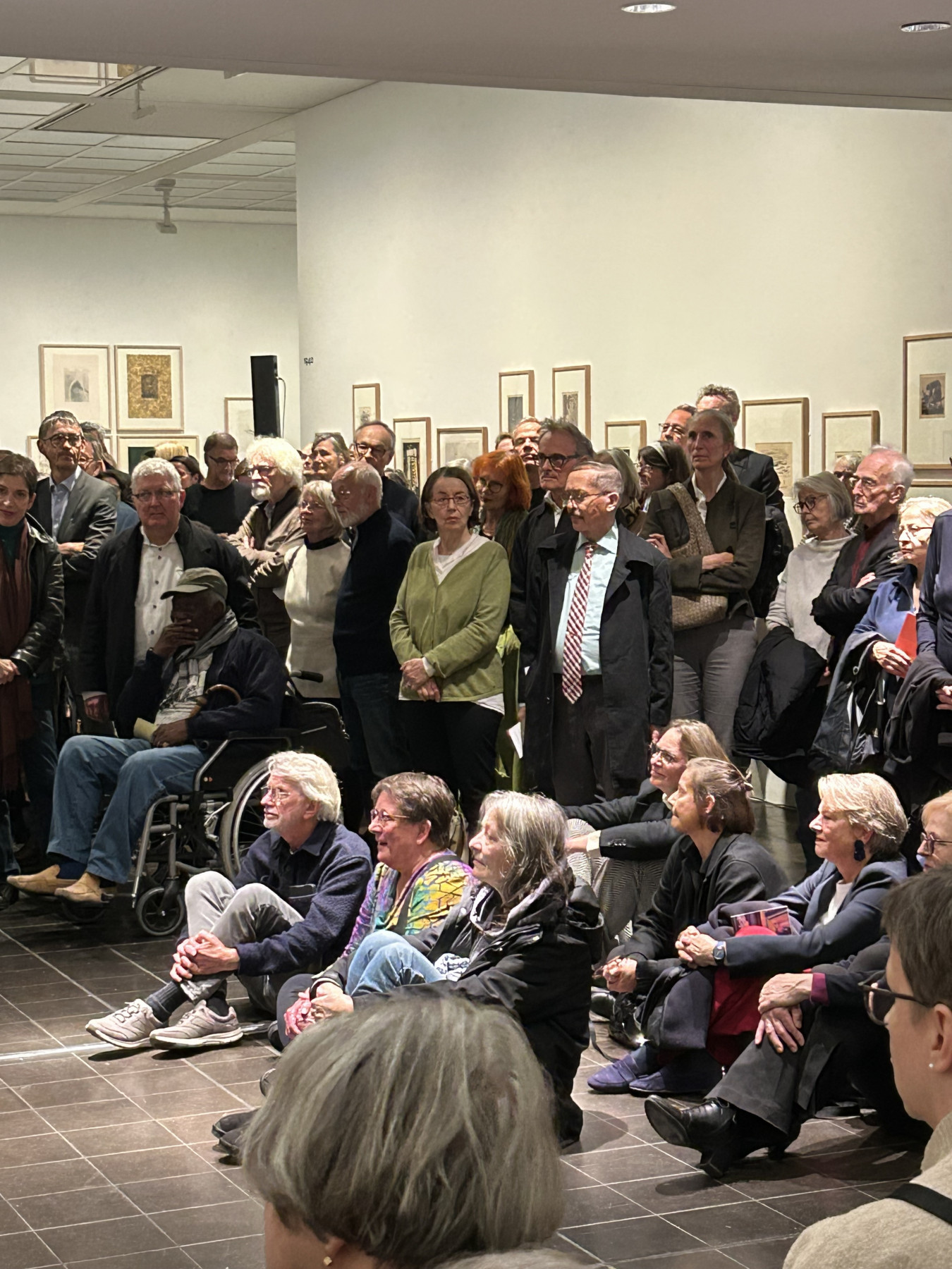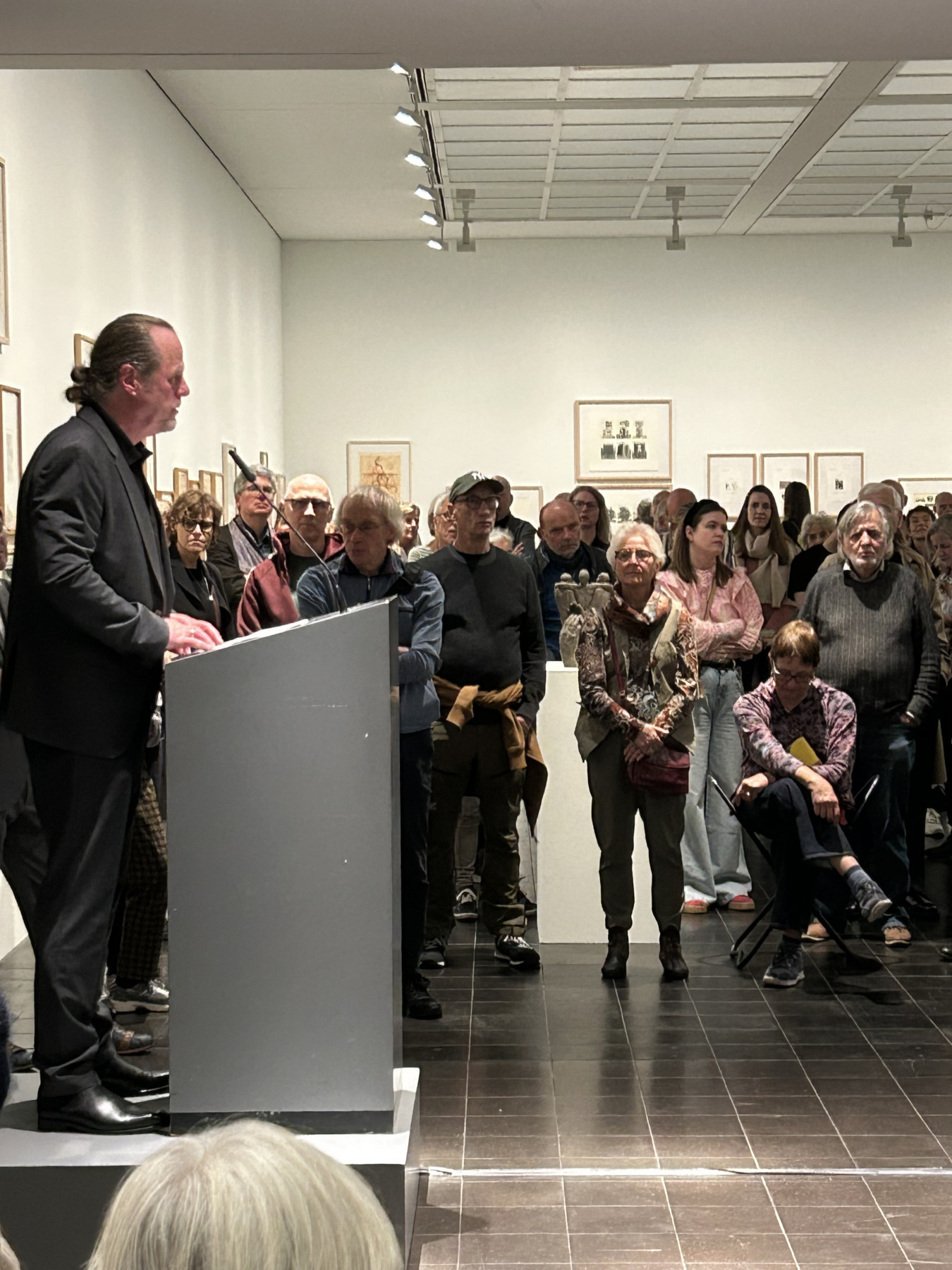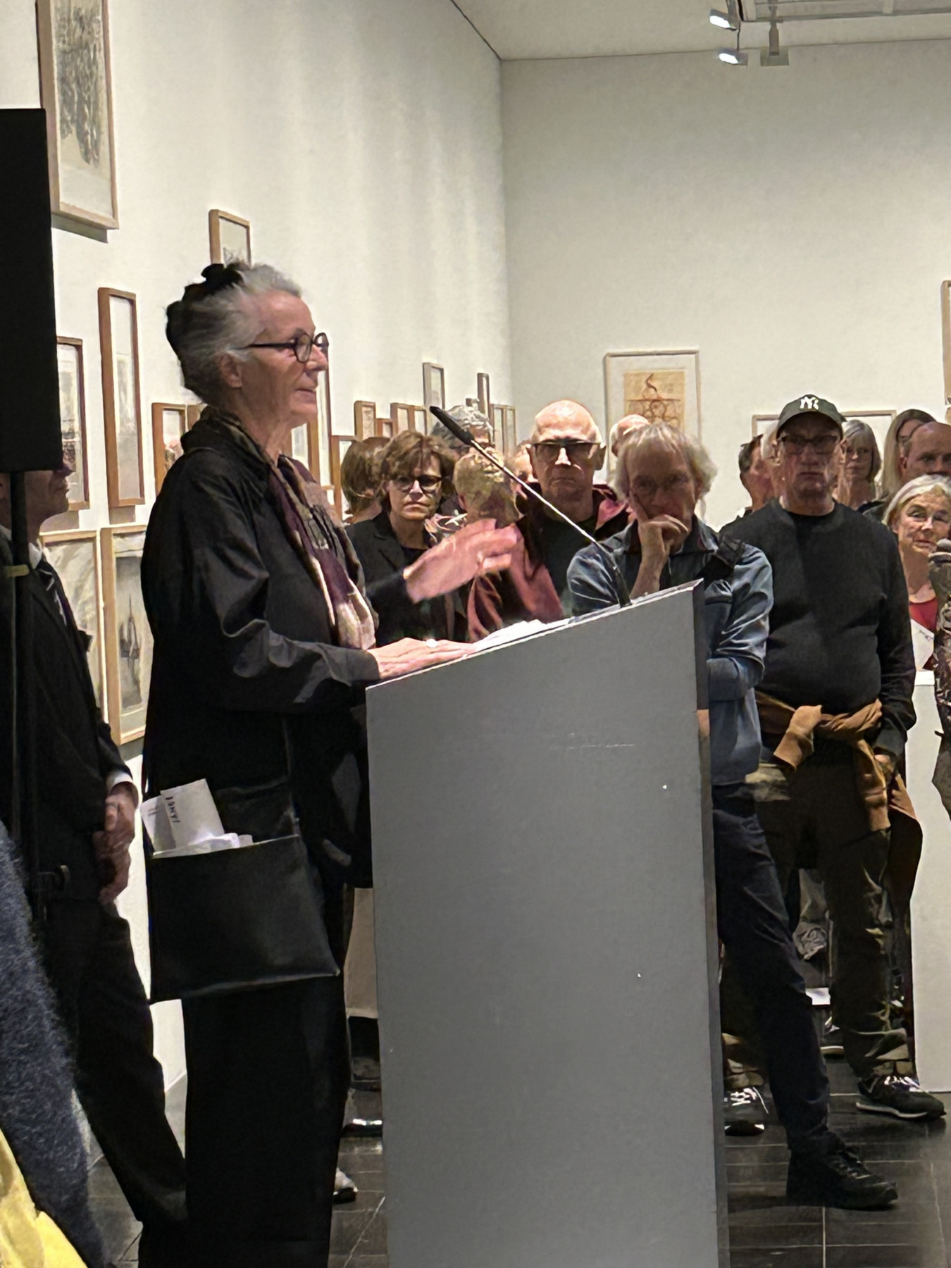 Der Ausstellungsraum im 3. Stock der Galerie der Gegenwart ist bereits gut gefüllt, als die Reden beginnen. Nach einer Begrüßung von Direktor Alexander Klar führt Corinne Diserens als Kuratorin in die Ausstellung ein. Dirk Dobke legt in seiner Eröffnungsrede den Fokus auf die Geschichte der griffelkunst. Herzstück bilden die Editionen aus dem Jubiläumsbuch Vielfalt, für das aus jedem Jahr des Bestehens eine Edition ausgewählt wurde. So beschreibt die Ausstellung gleich zwei Kreise: einen an der inneren Wand des als Rundgang angelegten Ausstellungsraums mit 100 Editionen aus 100 Jahren. Und weitaus mehr Werke an der äußeren Wand, in Vitrinen und eingezogenen Wänden.