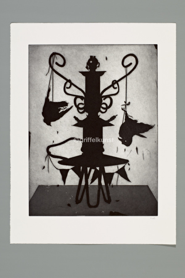 Dieser Prozess von Kles Malerei ähnelt dem Verfahren zur Herstellung einer Aquatinta Radierung. Wir haben Henning Kles eingeladen, seine beeindruckenden, schon in der Malerei sehr graphisch wirkenden Bilder in die Druckgraphik zu überführen. In Zusammenarbeit mit Daniel Vogler und Lars Dahms vom Atelier für Druckgrafik Hamburg ist ihm dieses hervorragend gelungen. Entstanden ist eine Serie von sechs Radierungen, die sowohl formal als auch inhaltlich an die Carnigula Serie anschließt, wie auch der Titel Garnicula, in dem nur ein Buchstabe ausgetauscht wurde, zeigt. Statt Bitumenemulsion auf die Leinwand aufzutragen, wird die Kupferplatte mit einer Aquatintaschicht versehen, die wiederum komplett abgeklebt und mit einer Vorzeichnung versehen wird. Mit Hilfe des Cutters wird das eigentliche Motiv abgenommen, im Säurebad in zwei bis drei Stufen geätzt und schließlich schwarz eingefärbt. Dabei entstehen scherenschnittartige Formen in abgestuften Hell-Dunkel-Kontrasten. Verwischungen sorgen im Hintergrund für einen wolkig-changierenden Plattenton.