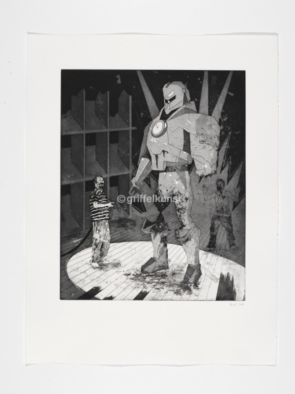 Die Reduktion der Mittel in der Druckgraphik kommt seiner Arbeitsweise dabei entgegen und lässt das graphische Gerüst seiner Bilder sichtbar werden. Die Orte des Geschehens sind nur angedeutet und wirken kulissenhaft. Durch die dramatischen Lichtverhältnisse liegen Teile des Bildes völlig im Dunkeln und nur wie durch einen Spot belichtet öffnet sich ein irreal anmutender Bühnenraum. Hier lässt Kles die für seine Arbeit charakteristischen Figuren auftreten: Die Protagonisten seiner Bilder sind Märchen- und Heldenfiguren, Kinder und Jugendliche, aber auch Obdachlose und andere Randgänger der Gesellschaft. Es umgibt sie eine gewisse Einsamkeit und Orientierungslosigkeit, eine Verwunderung über den merkwürdigen Ort, an dem sie gelandet sind. Verstärkt wird dieser Eindruck durch das Spiel mit Wahrnehmungsmustern und Größenunterschieden. So lässt die überdimensionierte Transformer-Figur im Zentrum des Blattes Unickron die Menschen in ihrer Nähe unverhältnismäßig klein aussehen und angesichts der Übermacht des Zitats aus der Popkultur regelrecht erstarren.