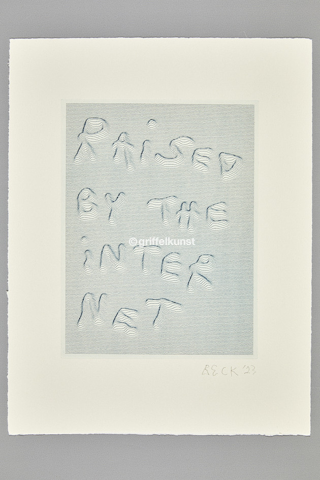 Die Bilder von Arno Beck sind Schnittstellen virtueller Computerwelten und manueller, künstlerischer Techniken. In seiner Edition zeigt er fünf Textarbeiten in Form linearer Darstellungen, die von einer CNC Maschine in die Kupferplatte gekratzt und als klassische Radierungen auf Papier gedruckt wurden. Wie sich das Digitale und das Analoge im Arbeitsprozess durchdringen, erfahren Sie in folgendem Interview, das Brigitte Bedei im Juli 2023 per E-Mail mit dem Künstler geführt hat:
