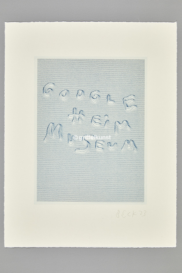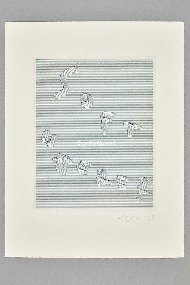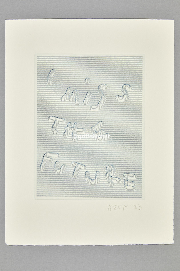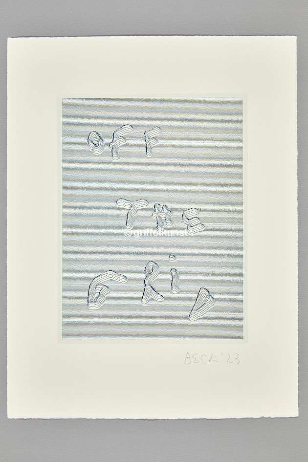 Arno Beck: Druckgraphik finde ich auf unterschiedlichen Ebenen recht passend für die Bearbeitung meines Sujets. Hierbei mag ich z.B. das Spannungsgefüge traditioneller Umsetzung und zeitgenössischer Bildform. Auch fasziniert mich, dass es sich beim Resultat um eine Prägung handelt, wodurch eine ursprünglich computergenerierte Graphik plötzlich haptisch und physisch erfahrbar wird. Das Aushebeln von Perfektion und Kälte durch die inhärente Lebendigkeit der Druckgraphik empfinde ich als auratisierend und belebend. Es würde mich nicht reizen, das am Bildschirm Vorliegende auszudrucken.
