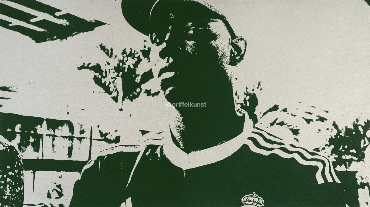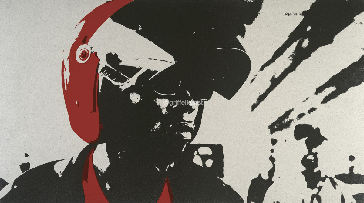 Karimah Ashadu, aufgewachsen zwischen London und Lagos, studiert Bildende Kunst und Raumdesign in London und Amsterdam. Nach ihrem Studium wendet sie sich zunächst der Malerei zu. Heute lebt sie in Lagos und Hamburg und beschäftigt sich intensiv mit dem Medium Film. Ihr Werk wurde vielfach ausgezeichnet, u.a. mit dem Lichtwark-Förderpreis (2025). Für ihren Beitrag auf der Biennale von Venedig erhielt sie 2024 den Silbernen Löwen. Aus dem dort prämierten Film Machine Boys stammen die Filmstills, die ihrer Griffelkunst-Edition zugrunde liegen. Diese präsentiert sie nicht als Photos, sondern übersetzt sie in Hochdrucke. In enger Zusammenarbeit mit Lars Dahms und Daniel Vogler vom Atelier für Druckgrafik in Wedel wurden die Motive zunächst invertiert und anschließend in verschiedenen Farben auf silbernen und goldenen Fond gesetzt. Wovon der Film handelt und wie sie zu der ungewöhnlichen Technik und Farbgebung ihrer Edition gefunden hat, erzählt sie in einem Interview, das Stephanie Bunk im Februar 2026 per E-Mail mit der Künstlerin geführt hat.