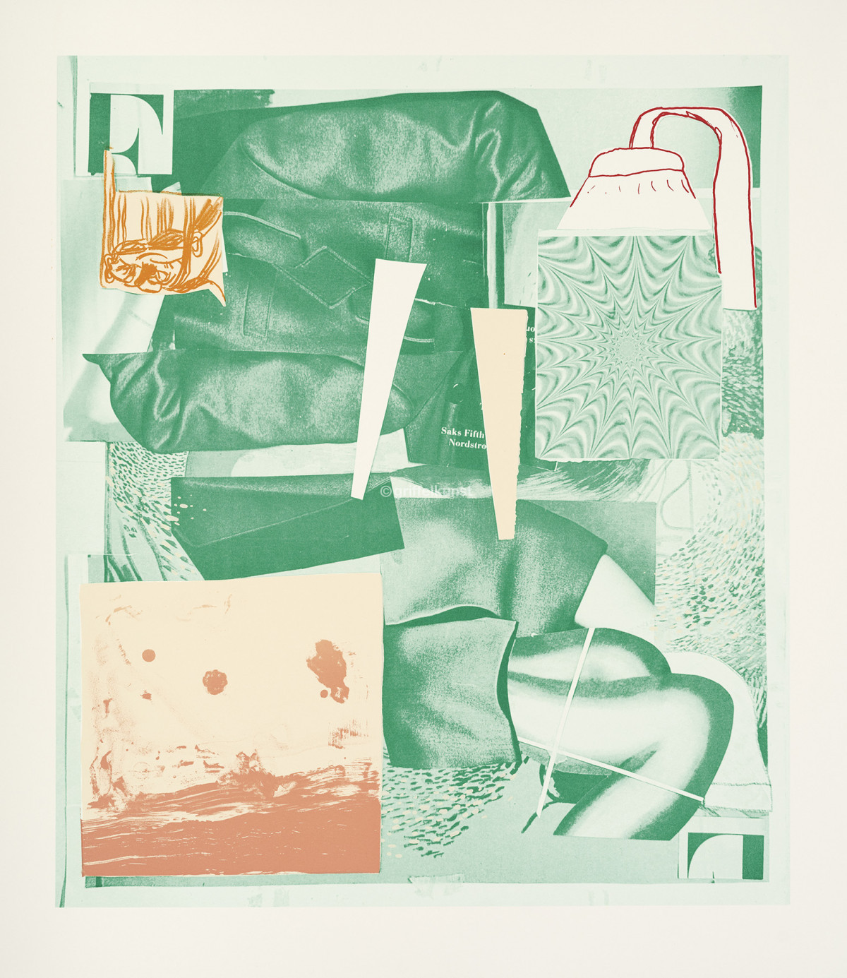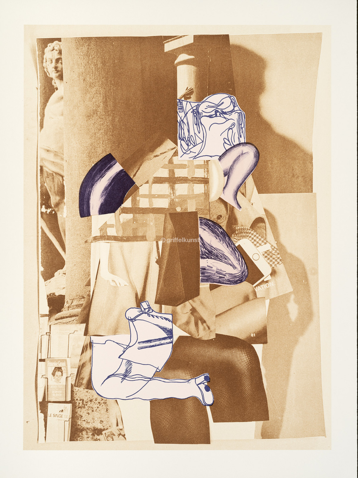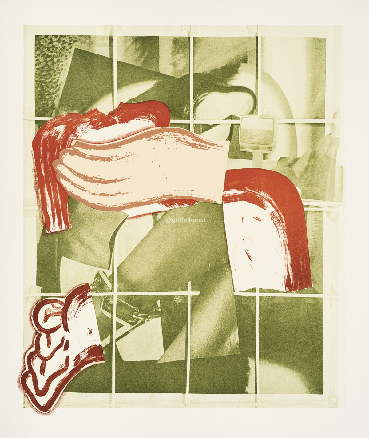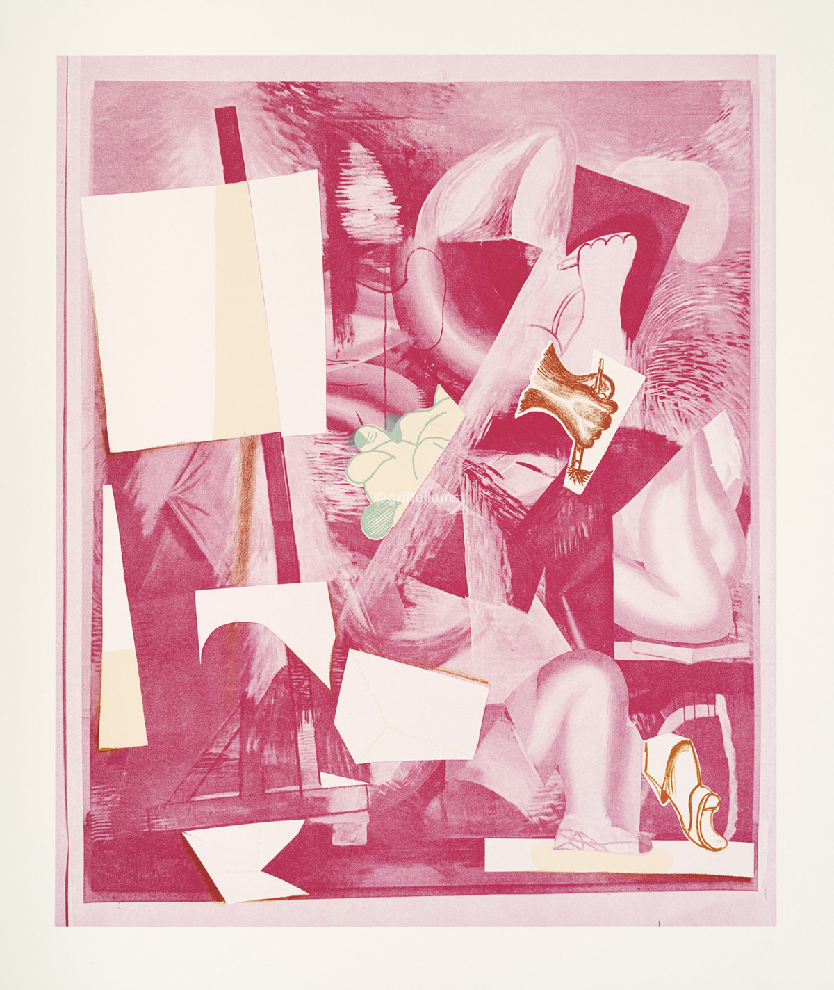 Zu Kristina Schuldts Werk zählen auch Collagen, für die sie eigene Zeichnungen, Malerei und Zustandsphotos von Werken mit gefundenem Bildmaterial verbindet. Dazu zählen genauso private Notizen wie Ausschnitte aus Magazinen oder aus historischen Versandkatalogbildern, die eine besondere Patina und Farbpalette mitbringen. Genau diese findet sich in ihrer Griffelkunst-Edition wieder. Dafür hat die Künstlerin sechs Collagen entwickelt, die sie für den Druck in der Werkstatt von Thomas Franke in Leipzig weiterbearbeitet. Sie schneidet einzelne Partien aus, verwendet die ausgeschnittenen Formen als Schablonen und schafft durch die Aussparungen Freiflächen, die sie in der Technik der Lithographie und im Siebdruck ausfüllt. Trotz dieses durchdachten Zerlegens der Motive verlieren ihre Arbeiten nichts von ihrer Spontanität und Prozesshaftigkeit. Brüche und Übergänge bleiben sichtbar, wenn auch schwerer entzifferbar. Wie bei einem Trompel' OEil scheinen Zettel auf dem Papier zu liegen. Hinter- und Vordergrund geraten in Bewegung und die Grenzen zwischen Malerei, Zeichnung und Photo werden im Druck aufgehoben.